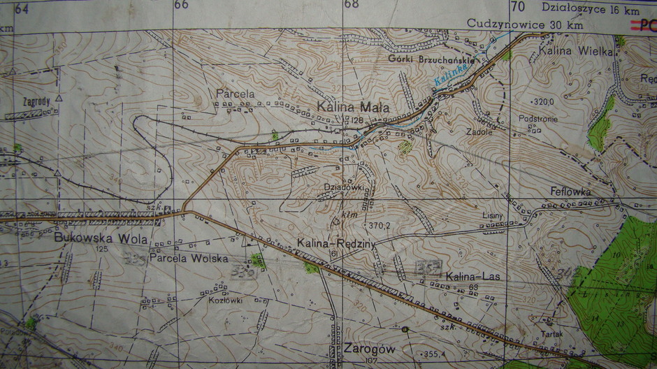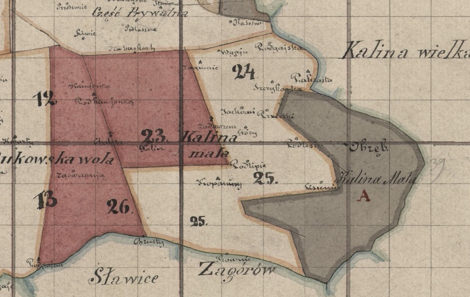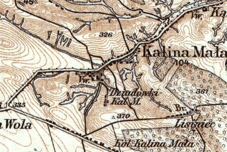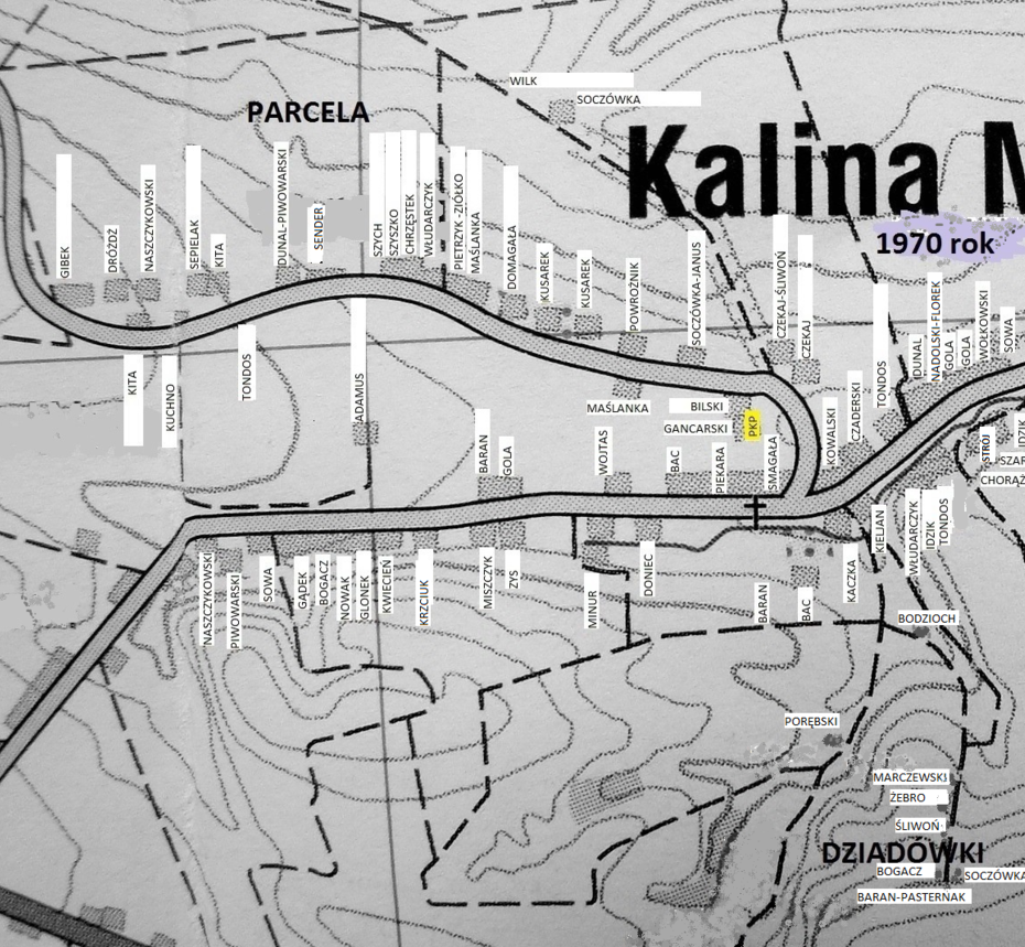 Część wsi powstała po parcelacji majątku ziemskiego była dzielona na działki chłopskie w latach 20. inaczej. Chyba chodziło o to by pola nie znajdowały się zbyt daleko od domów i zabudowań gospodarskich. Jan i Stanisław Brodowie kupili po nieco zniżonych cenach swoje działki (jako żołnierze walczący z bolszewikami). Było to pole położone między torami kolejki wąskotorowej i szosą, na zachód od pierwszego gospodarstwa chłopskiego Tondosów (po IIWŚ gospodarował tam Janiu Tondos). Od strony zachodniej ograniczała go droga biegnąca od szosy do stacyjki kolejowej i skręcająca za torami na zachód (widać więc, że nie kupili Brodowie tego pola za wiele; to też w 1925 roku Jonek sprzedał bratu Stachowi swoją działkę, wziął spłatę za ojcowiznę od swojego szwagra, a mojego dziadka, Franciszka Dąbrowskiego i wraz z żoną Wiktorią Matias z Kaliny Wielkiej oraz synem Henrykiem urodzonym jeszcze w Kalinie Małej wyjechał na Kresy; tam niedaleko Wołkowyska kupił ziemię i założył gospodarstwo jako osadnik wojskowy w kolonii o nazwie Dobrosielce; w 1939 roku cała - już wtedy liczna - rodzina została wywieziona do Stanów … Kazachskich! O tej zsyłce ciągle zabieram się opowiedzieć osobno). Na północ, za torami kolejowymi, działkę zakupił Franciszek Czekaj, a wyżej – Soczówka – Chertuś ( uchertać – w Kalinie znaczyło kiedyś: urżnąć byle jak; zetknęliście się z takim słowem?) i - jeszcze wyżej, bo teren tu ciągle się wznosił – Wilk. Do ich domów ta droga biegnąca do stacyjki miała zdaje się przedłużenie (było tu rozwidlenie dróg) zaczynające się w miejscu jej zakrętu na zachód i biegła w górę.