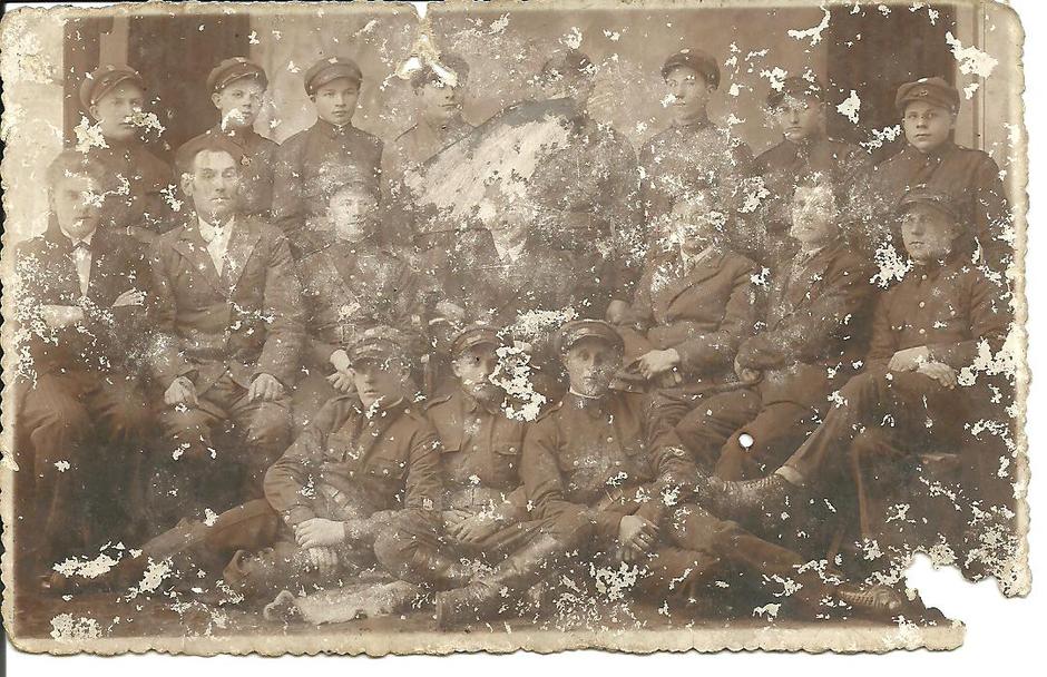 3_Zdjęcie przysłane przez ciotkę Halinę Kowalską. W tej grupie żołnierzy jest jej ojciec, Stanisław Broda, syn Maianny i Ludwika. Zaznaczyła go wypalając dziurkę na jego kolanie. Co to za odział wojska i kto tu poza tym jest do rozpoznania? – to problem otwarty. Chyba nie jest to ten oddział POW z Kaliny Małej, bo byłby na tym zdjęciu i jego dowódca, Franciszek Broda, a na niego pewnie ciotka zwróciłaby moją uwagę.