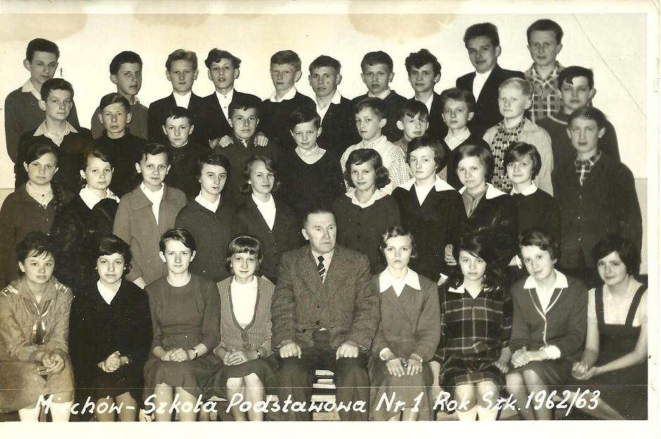 Grupa kalińskich dzieci z nauczycielką p. Leokadią Kukuryk (trzyma na ramieniu właśnie Felka; to ten blondasek z bujną czupryną). Było to około 1955 roku. Chyba w pobliżu budynku szkolnego w Kalinie Małej? Moja mama, Marianna z domu Kowalska, jej pierwsza synowa, która latem 1948 roku, po wyjściu za najstarszego syna, Adolfa, przyszła razem z nimi mieszkać, miała okazję to obserwować. Przyszła z Cieplic koło Gołczy, z rodziny równie licznej – miała trzy starsze siostry i trzech starszych braci oraz jednego młodszego. Mama wspominając po latach o tym, a opowiadając to gdy już ja dorastałem, nie mogła się wychwalić jak bracia ojca dobrze się uczyli zarówno w pierwszych pięciu latach w Szkole Podstawowej w Kalinie Małej, jak i dwu ostatnich klasach tej szkoły, które kończyli w Kalinie Wielkiej. Wiem, że wyjątkiem był tu tylko stryj Józek, który kończył SP w Miechowie i później ja poszedłem w jego ślady. Stryj Józek znalazł się w SP Nr 1 w Miechowie zdaje się za sprawą swojej mamy chrzestnej, którą była Lubosza Karpińska, wtedy zdaje się już ucząca w tej szkole po ukończeniu studiów historycznych na UJ w Krakowie. Ja chodziłem do tej szkoły w roku szkolnym 1962/63 gdy było już po ślubie Luboszy i stryja Stacha i ich zamieszkaniu w Nowym Dworze Mazowieckim. Stryj Stach po ukończeniu szkoły oficerskiej we Wrocławiu dostał pracę w Modlinie, gdzie w dawnej twierdzy mieściła się jednostka wojskowa; nie byle jaka – był tam największy garnizon wojskowy w czasach PRL. Gdy więc ja chodziłem do SP Nr 1 w Miechowie, nie było już Luboszy wśród uczących tam nauczycieli, ale nauczyciele mnie już z nią kojarzyli. Odczuwałem nie raz w trudnych sytuacjach ich sympatię. Najwyraźniej okazywała mi ją pani Krzyżakowa ucząca nas matematyki i wychowawca Feliks Tustanowski, nauczyciel uczący nas prac ręcznych w dobrze wyposażonej pracowni; uczył nas przedmiotu, który jeszcze wtedy cieszył się resztką przedwojennego znaczenia. Ten ostatni robił to na swój sposób, to jest szorstko mnie traktując i wyśmiewając się nie raz ze mnie, ale tak, że czułem jego sympatię. Ta sympatia przydawała się, bo poziom nauczania był w tej szkole wyższy niż w naszej kalińskiej.