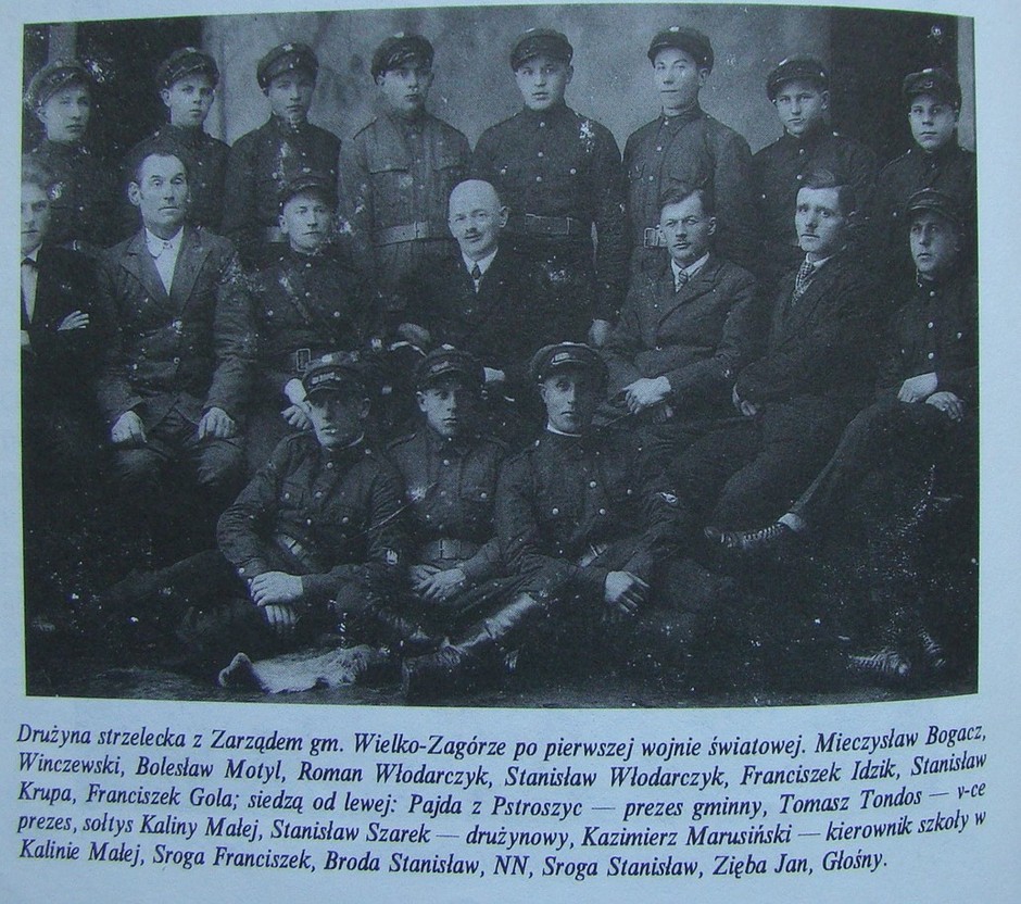 W podpisie zdjęcia czytamy na wstępie: Drużyna strzelecka z Zarządem gm. Wielko-Zagórze po pierwszej wojnie światowej.