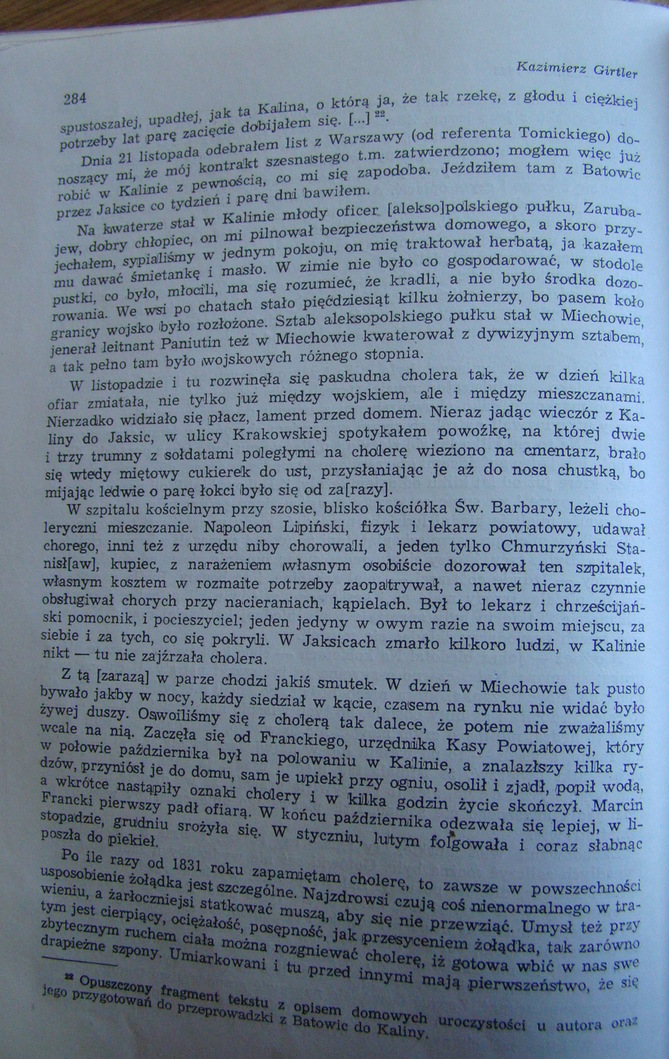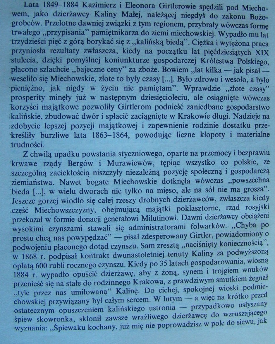 .(wg wpisu w księdze urodzeń parafii Miechów). w Kalinie urodziła się cała trójka dzieci syna Kazimierza Girtlera -Bolesława:Eleonora (ur. ok. 1870), Wanda (ur. 1.05.1871) i Kazimierz junior (ur. 1872).